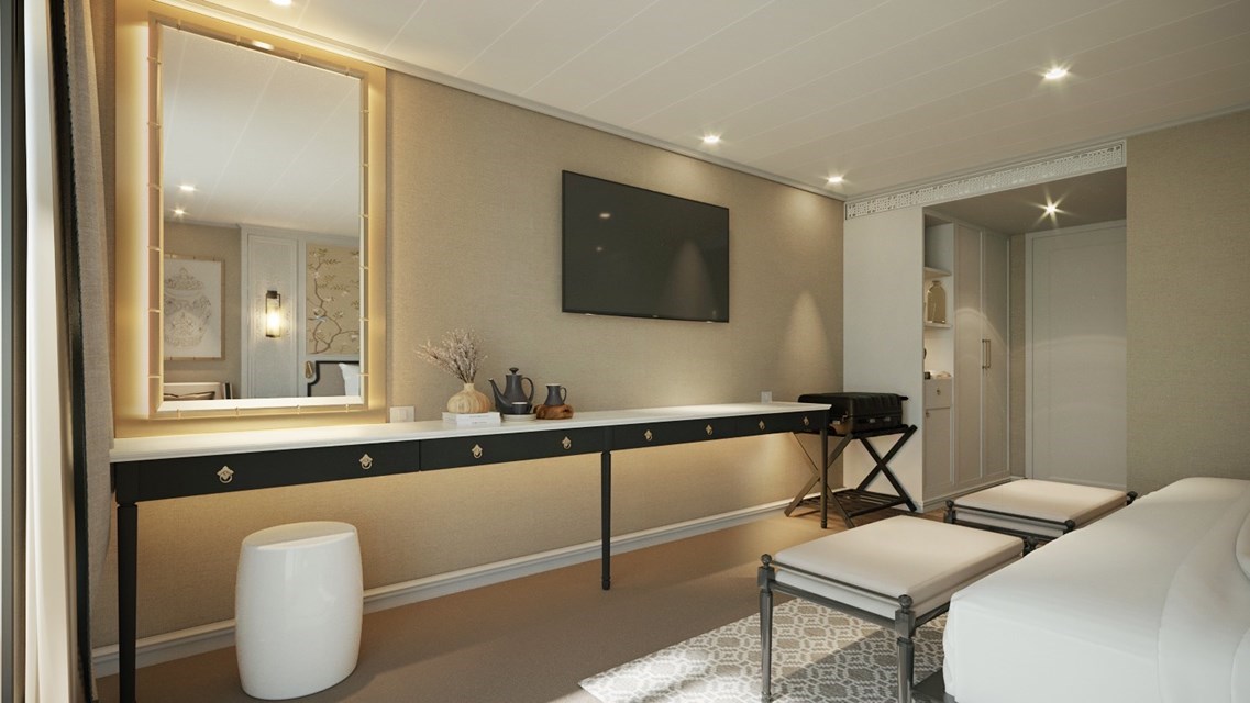 Het cruiseschip heeft ook vier uitzonderlijke suites (Suites Terrasse) op het bovendek en zonnedek (Celeste, Imperial, Jade en Mandarin), variërend in grootte van 85 m2 tot 105 m2, met terrassen van 16,8 m2 tot 18,5 m2 (uitgerust met ligstoelen, tafel en stoelen). Een privé lounge biedt u de mogelijkheid om in alle privacy te ontspannen.
