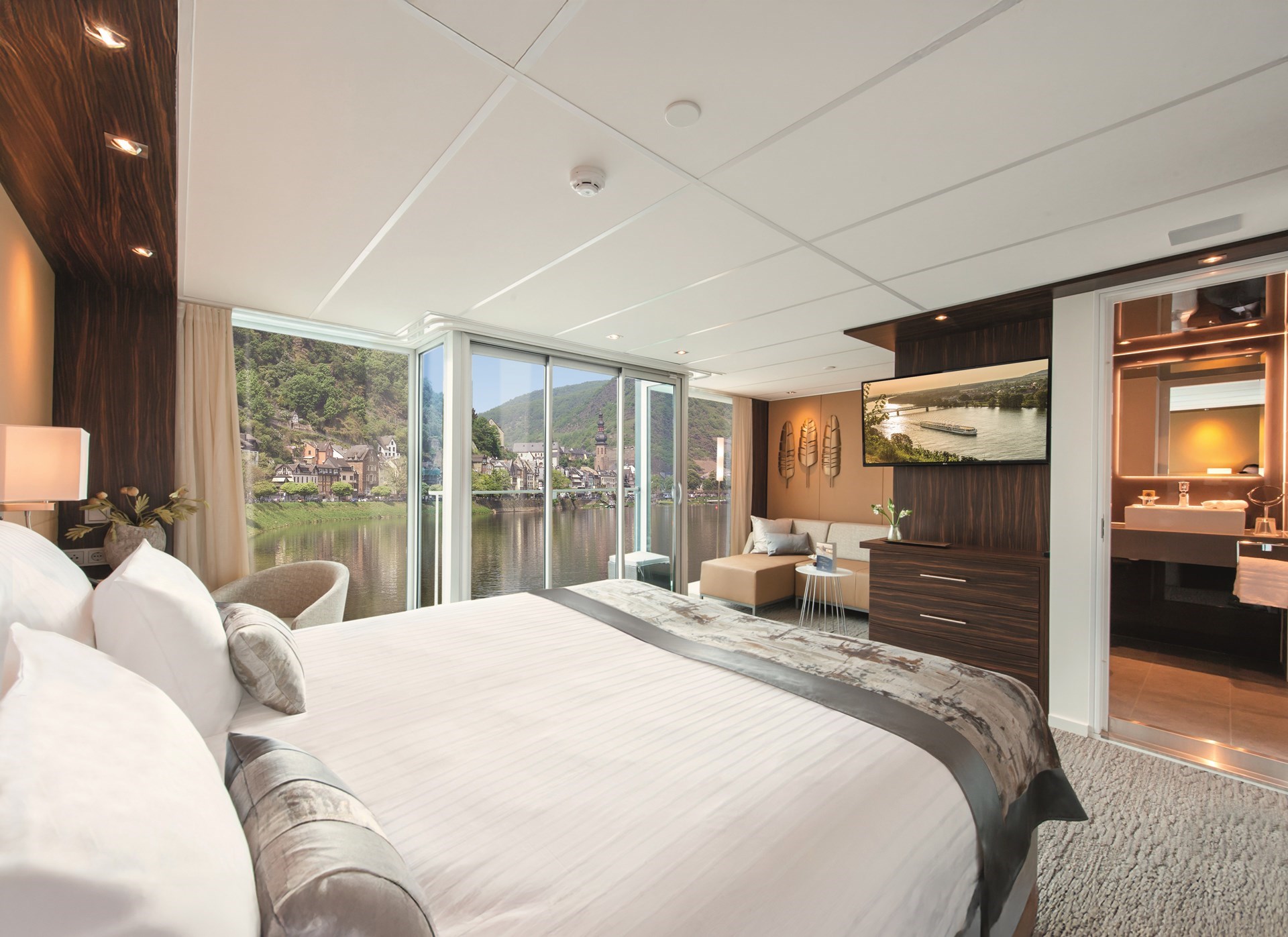 De kajuiten bieden alles wat u maar kunt wensen in een drijvend 5*-hotel: flatscreen-tv, minibar (Bovendek en Panoramadek) kluis, föhn, airconditioning, douche/toilet. Alle kajuiten zijn bijzonder ruim met veel lichtinval én een moderne, gezellige inrichting.