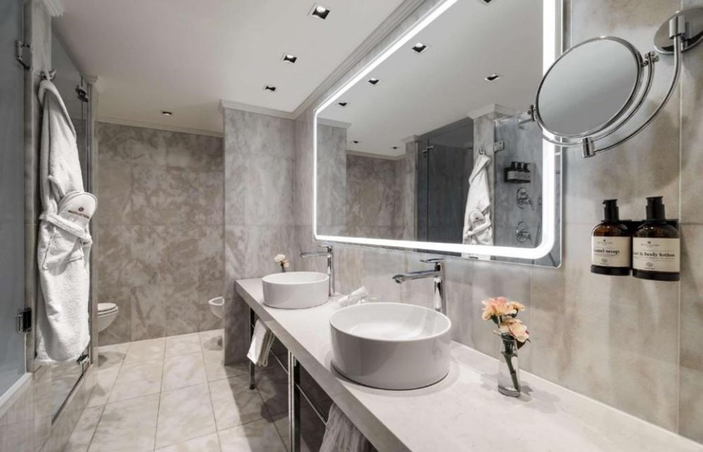 De 152 kamers van het hotel zijn elegant ingericht in een eigentijdse stijl, met comfortabele bedden en marmeren badkamers.