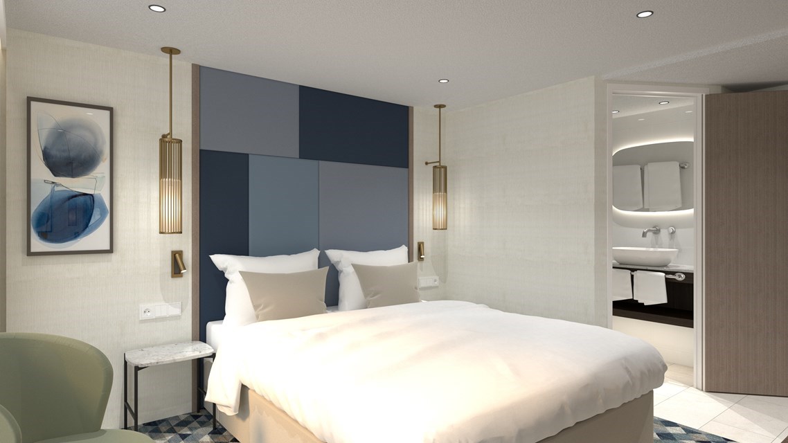 De kajuiten bieden alles wat u maar kunt wensen in een drijvend 5*-hotel: flatscreen tv, radio, minibar, kluis, föhn, airconditioning, douche/toilet. Op het Emerald dek (onderste dek) vindt u buitenkajuiten. Het Ruby dek (middelste dek) heeft buitenkajuiten (16m2) met 2 aparte bedden die op verzoek kunnen worden gescheiden. Op het Diamond dek (bovenste dek) kunt u heerlijk ontspannen in buitenkajuiten (16m2) en suites (24m2). De kajuiten op het Ruby dek en Diamond dek beschikken over openschuivende ramen welke van de vloer tot het plafond reiken (= Franse balkons). Hierdoor heeft u een onbeperkt zicht op de rivier, de mooie landschappen, en geniet u van 1.000 wisselende uitzichten. De kajuiten op het Emerald dek hebben kleinere ramen welke om veiligheidsreden niet te openen zijn.