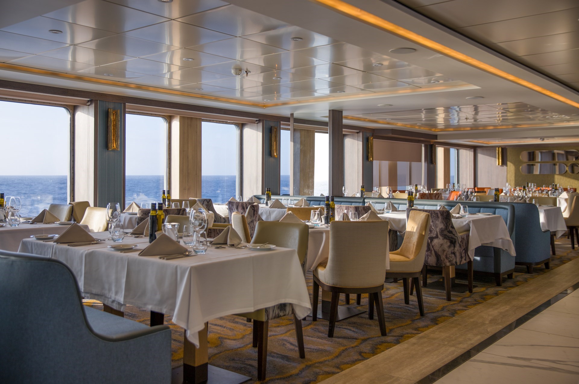Het restaurant serveert voor het diner een lekkere en verfijnde keuken à la carte, in één enkele dienst. De borden worden à la minute klaargemaakt, wat garant staat voor versheid en een maximale afstemming op uw wensen. Tijdens deze cruise kunt u genieten van de galadiners waarbij de gerechten ontwikkeld zijn door de Portugese topchef Rui Paula en de Franse topchef Stéphanie Le Quellec, beiden beloond met twee Michelinsterren. Het ontbijt en de lunch worden geserveerd in buffetvorm en à la carte in het restaurant.